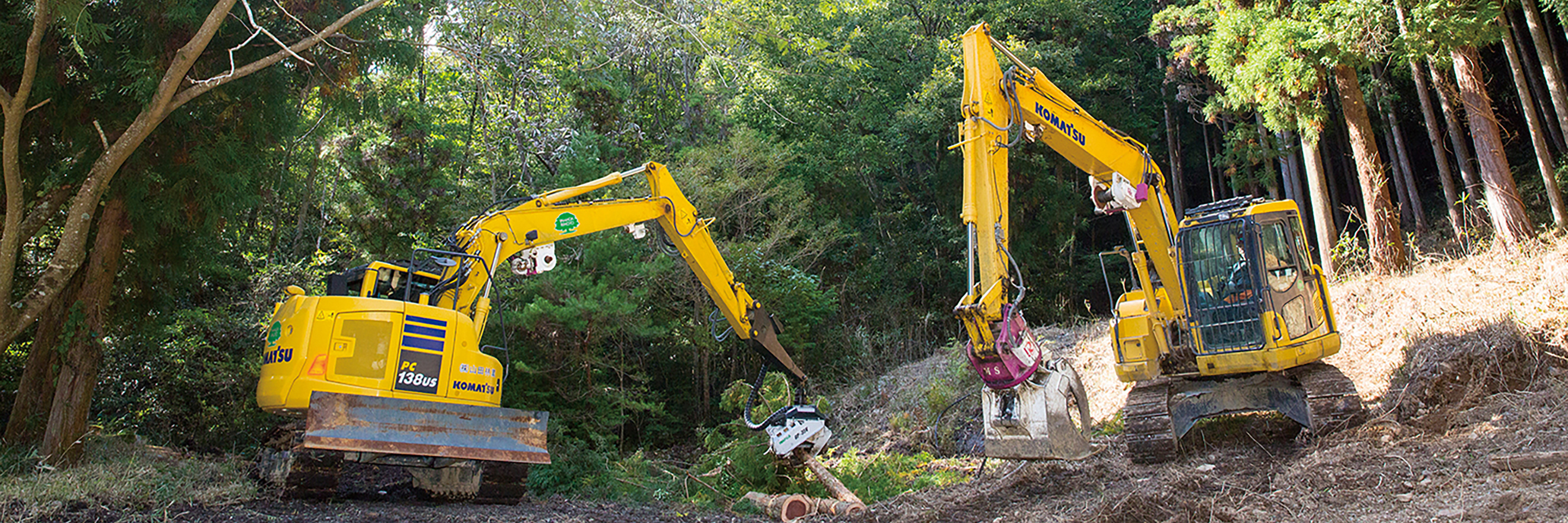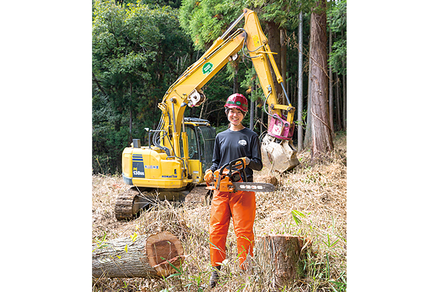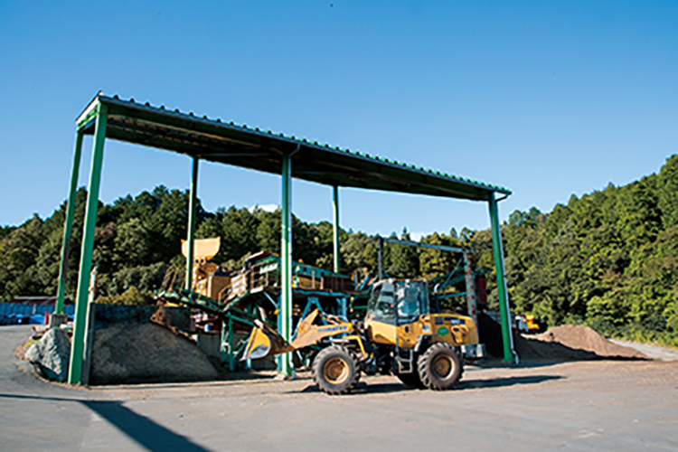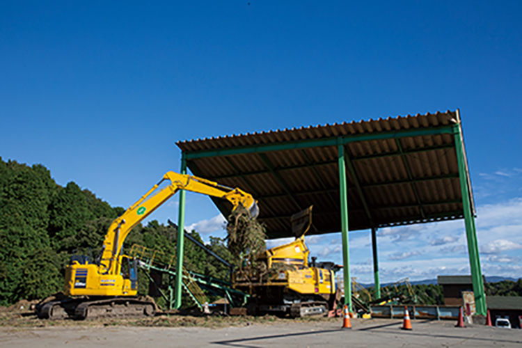山田林業が伐採工事を始めた当時は、廃棄された伐採木や木くずを野焼きすることが一般的であったが、大気汚染などの環境問題により野焼きが禁止されるようになる。そこで、同社は産業廃棄物中間処理許可を取得。コマツBR200Tを導入しリサイクルプラントをつくり、自社の伐採木はもちろん近隣の造園業者の剪定枝なども受け入れ、バイオマスや肥料の原料となるチップを製品化。環境負荷を低減させるバイオマス発電などで再利用されている。