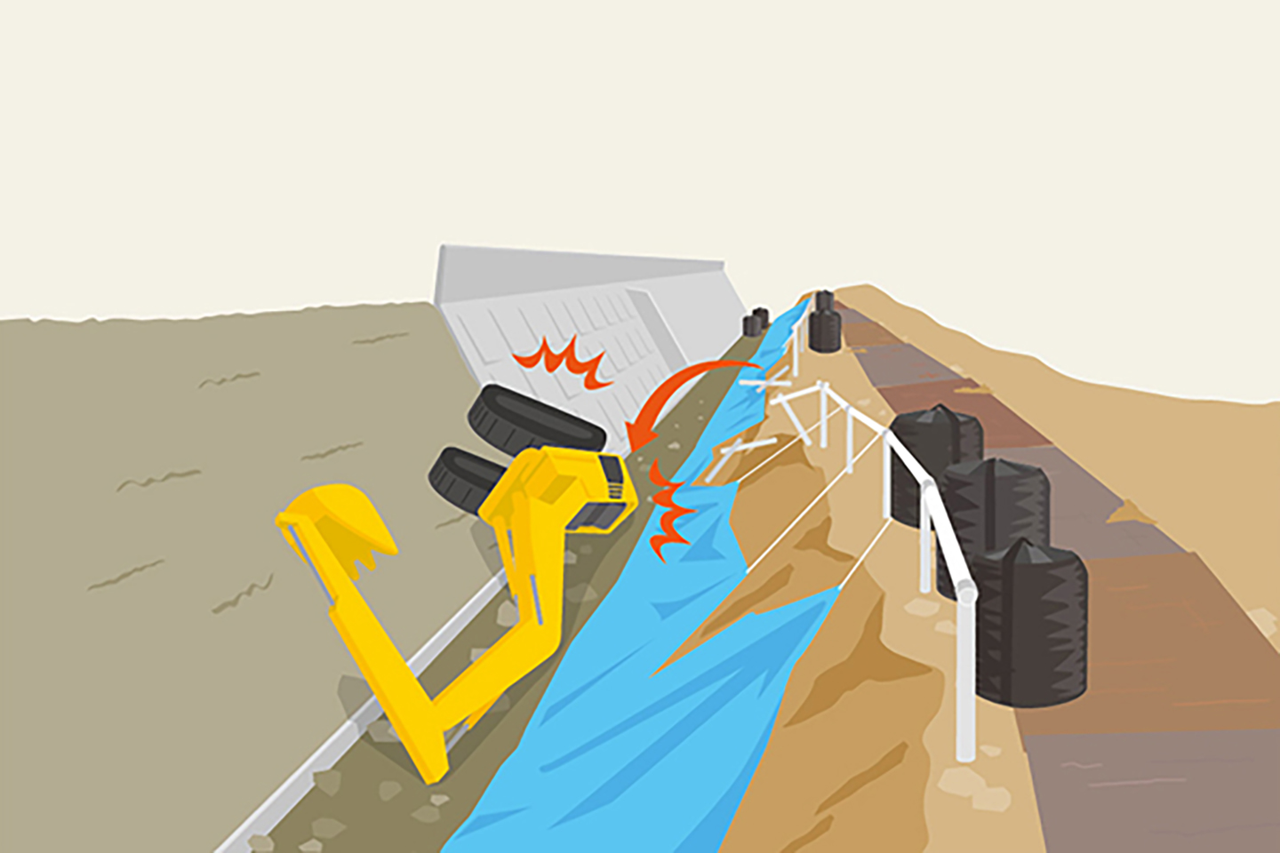 クレーン機能付き油圧ショベルで大型土嚢(重量1トン)の設置作業を行っていたところ、足元の法面の法肩部分が崩壊したため、油圧ショベルが法面を滑り落ちながら転落し、底面で横倒しとなった。被災者はキャビン内で身動きがとれなくなったが、他の作業員によって救出された。