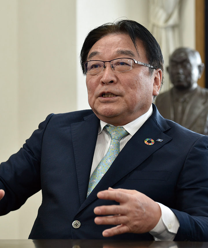上海からも東京からも1,000㎞。アジアと日本をつなぐ拠点となる北九州。ここには、「門司港」「小倉港」「洞海港」の3つの港があり、それらを総称して「北九州港」という。そのなかでも、モダンとレトロが融合し、観光スポットとして名高い門司港。門司港で物流の起点となる事業を展開しているのが門司港運株式会社だ。「『海運』と『陸運』の間にいるのが『港運』。我々の仕事は船会社と荷主をつなぐことです」と代表取締役社長の野畑昭彦氏は自社の事業について語る。
