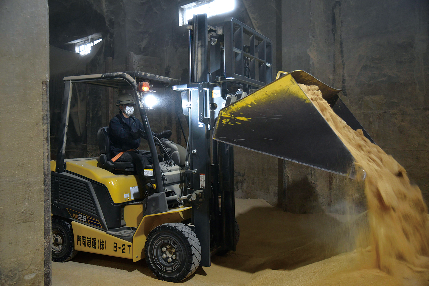 同社倉庫部が扱う主な品目は飼料だ。倉庫課ではグルテンフィードと呼ばれるトウモロコシを原料とした畜産飼料と、魚粉を原料とした水産飼料を取り扱っている。それらの移動に使用される荷役機械がフォークリフトだ。ショベルローダーやヒンジなど用途に合わせ、アタッチメントを変えて作業に使っている。