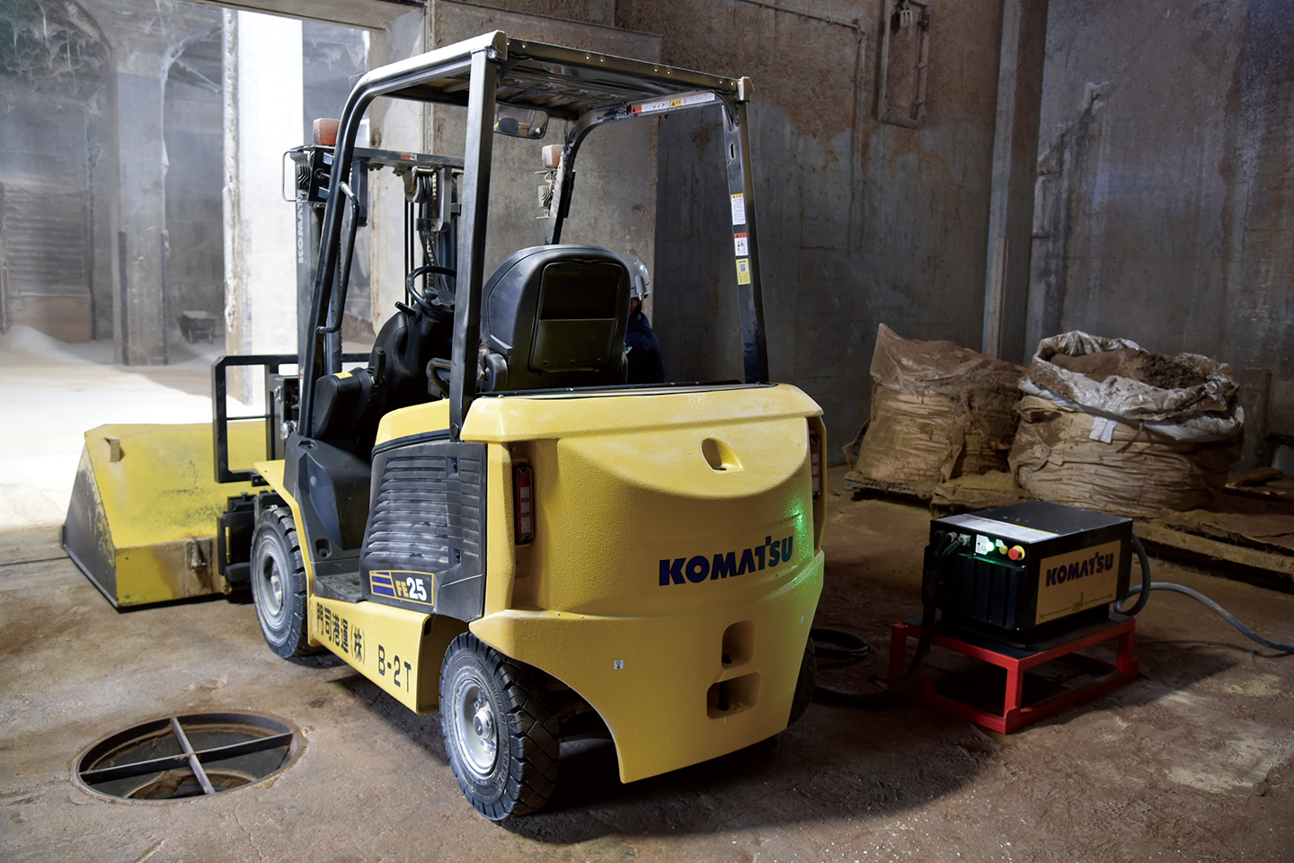 「コマツの展示会でFE25と出会い、電動式ならではの機能に関心を持ち、デモ機を試用しました。実際に耐塵性と作業性を確認すると、エンジン式とは異なり、粉塵を巻き上げないので、当社の作業には向いており、購入することにしました。エンジン式に比べパワーが劣るのではと危惧していましたが、まったく問題ありませんでした。操作も楽で、オペレーターへの負担が大きく軽減されました」と倉庫部倉庫課課長の安永隆彦氏は電動式フォークリフトへの信頼を語る。