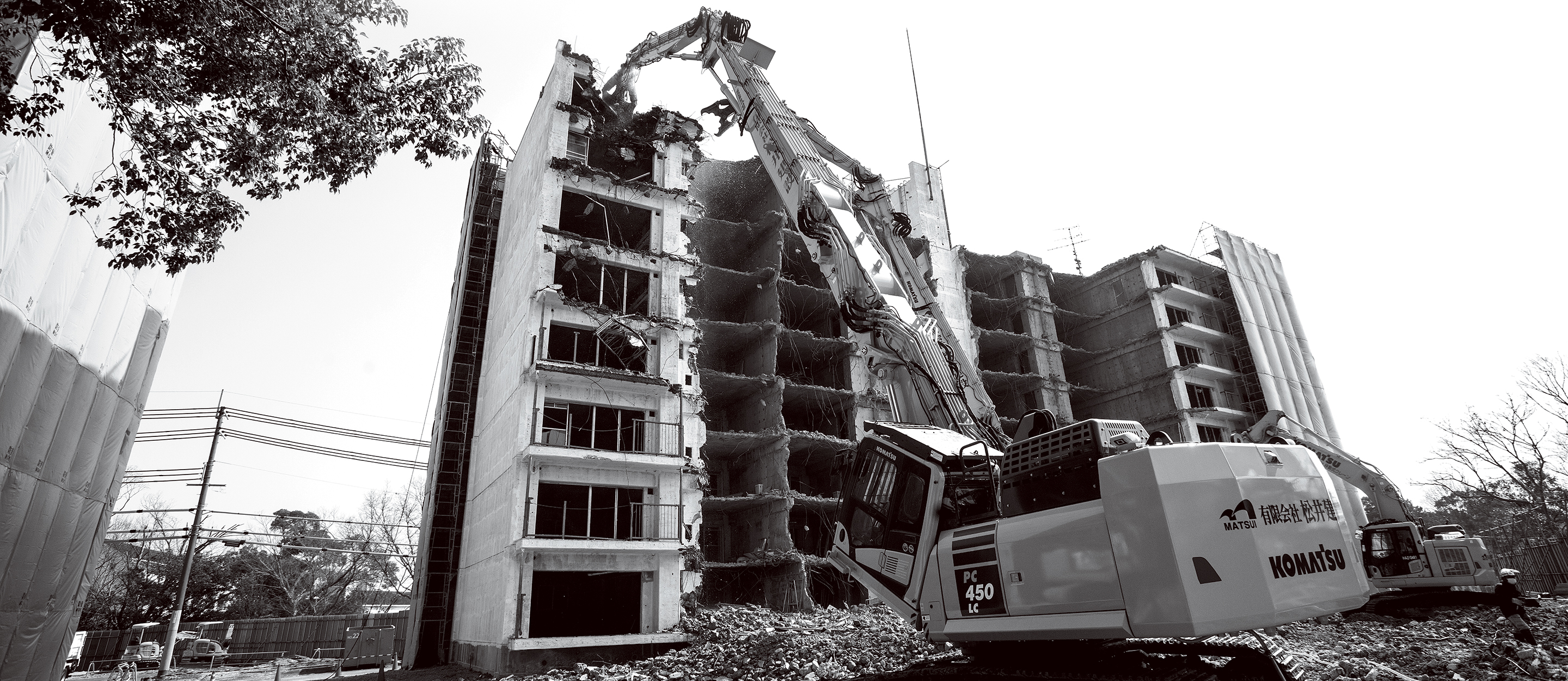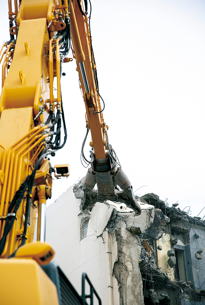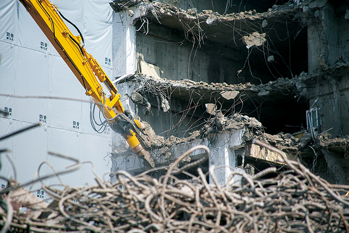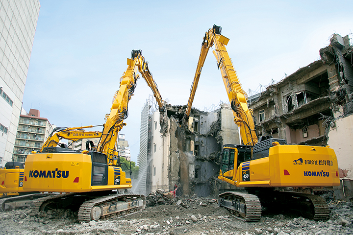 解体業務では、実際に外装材や内装材を外して初めてその建物の構造が見えてくる。現場を任される解体業者には、状況に応じた的確な対応が求められる。「解体業務の進め方には『これが正解』という手法はありません。キレイに安全に素早く終われば、それが正解なんです。正解に導くためには、機能にゆとりのある建機が必要になります。ワンクラス上の機能性を持った建機で、無理をせずに安全に作業を進めることが大切です」と松井社長は解体業務の「正解」について解説する。