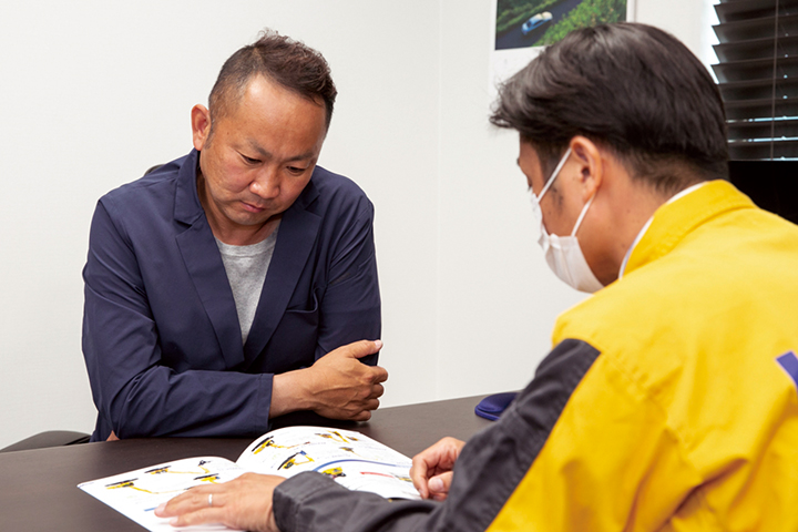 コマツの営業担当と建機に関するディスカッションを行う松井社長