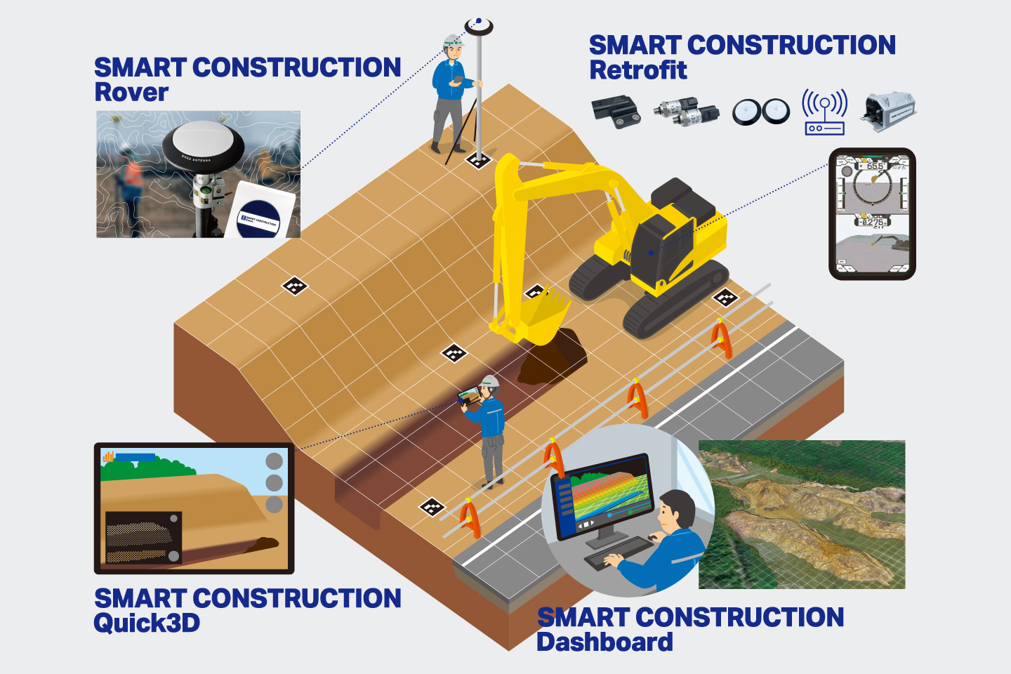 この性能を最大限活かすために、Smart Constructionには、圧倒的なコストパフォーマンスを実現したSmart Construction Roverや、現在利用している油圧ショベルに後付け可能なSmart Construction Retrofit、また、遠隔地でも全現場関係者と現場のリアルタイムな情報を共有できるSmart Construction Dashboardなど、小規模土工の現場を下支えするラインナップを充実させた。