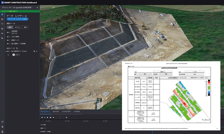 現場の計測データを集約、最新の実績状況をデジタルの地形上に表示。刃先情報とも連携し、土量や進捗率などをリアルタイムに把握