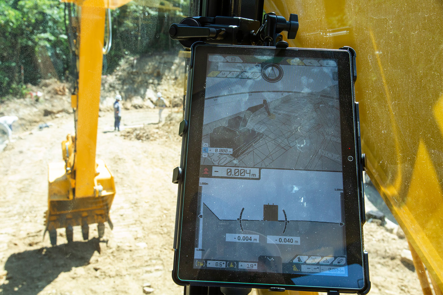 同社では、図面の3D化を必要としないクイックスマートコンストラクション(クイックスマコン)という手法によりICT施行を行っている。クイックスマコンとは、ICT建機の無限平面を作成する機能と平面図をモニターに表示する機能を活用し、簡単に3D施工を実現するICT施工の手法だ。測量は固定局を必要としないSmart Construction Rover (スマート・コンストラクション・ローバー)によるGNSS測量を行っている。レトロフィットキット装着機と連携することで、ローカライゼーションデータを測量しながら随時取り込むことができる。これにより、測量の手間を大きく省くとともに、簡単にICT施工が行える。