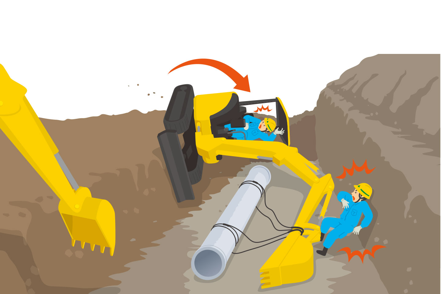 下水道流入管布設作業で、掘削補助のドラッグショベル(ミニバックホー(0.14㎥))が塩ビ管(φ500、L=5m、W=258㎏)を吊り上げ、所定場所に設置しようとして転倒し、下で作業していた作業者がブームと激突した。本来この作業は横にいた0.45㎥バックホーの仕事だった。