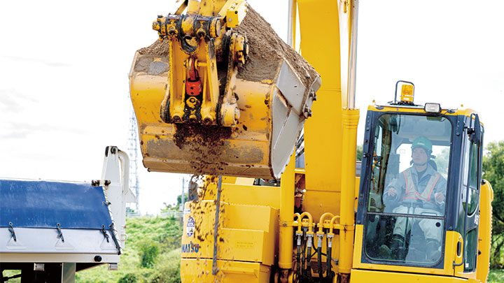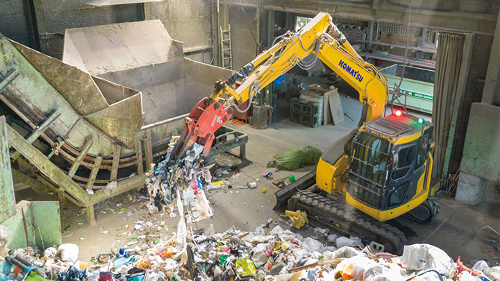 有線式電動油圧ショベルは、これからの廃棄物処理の現場を力強くサポートする。