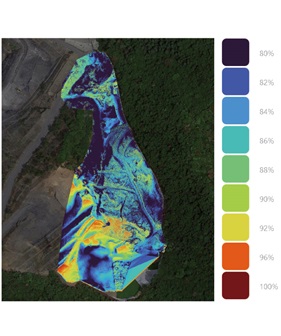 ICT施工やGNSS測量を実施するには、安定した衛星の捕捉が必要になる。従来は、現場の上空にGNSSを遮蔽するものがないか目視で確認をするか、個々による感覚で判断せざるをえなかったが、DXの活用で地 形データを利用し、空が見えている割合(天空率)が算出可能になった。局所的にGNSSの捕捉できない箇所も確認でき、無駄なく丁張りを設置。施工計画に有効な機能だ。