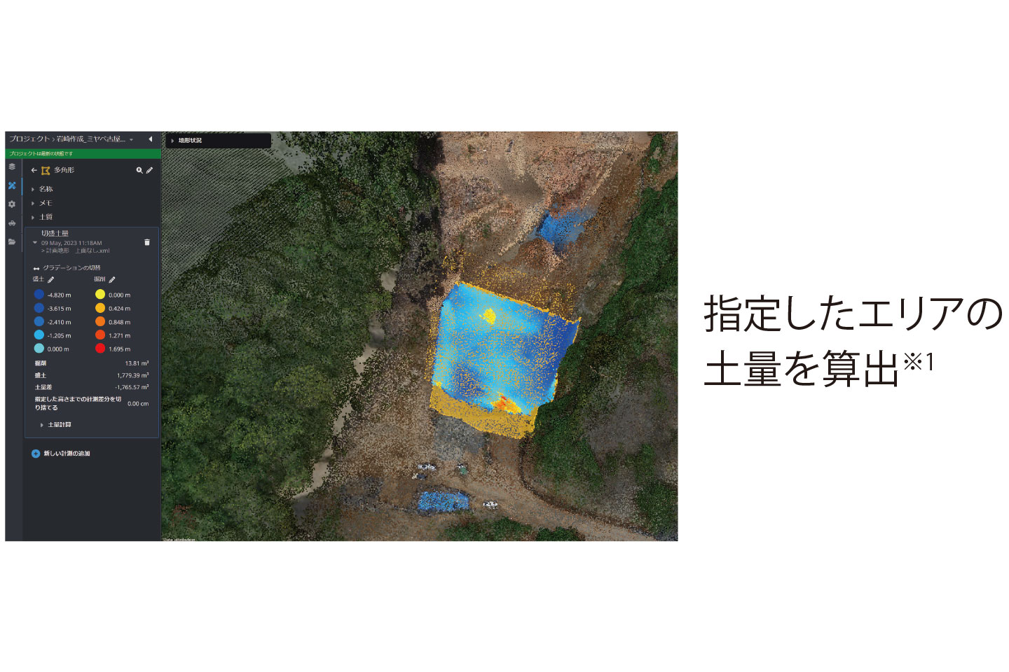 ドローン計測により取得した現場の点群と完成形状3Dモデルをデジタルツイン上で重ねて比較することで土量を算出。土配計画の補助として活用することで、時間短縮と業務効率化につながった。エリアを指定することで、部分的な土量の算出も可能に。