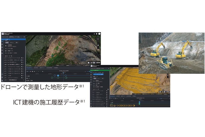 日々のドローン計測により、進捗状況をクラウド上で管理できるように。また、Smart Construction DashboardとICT建機を連携することで、建機の施工履歴をSmartConstruction Dashboard上に自動で反映することが可能。