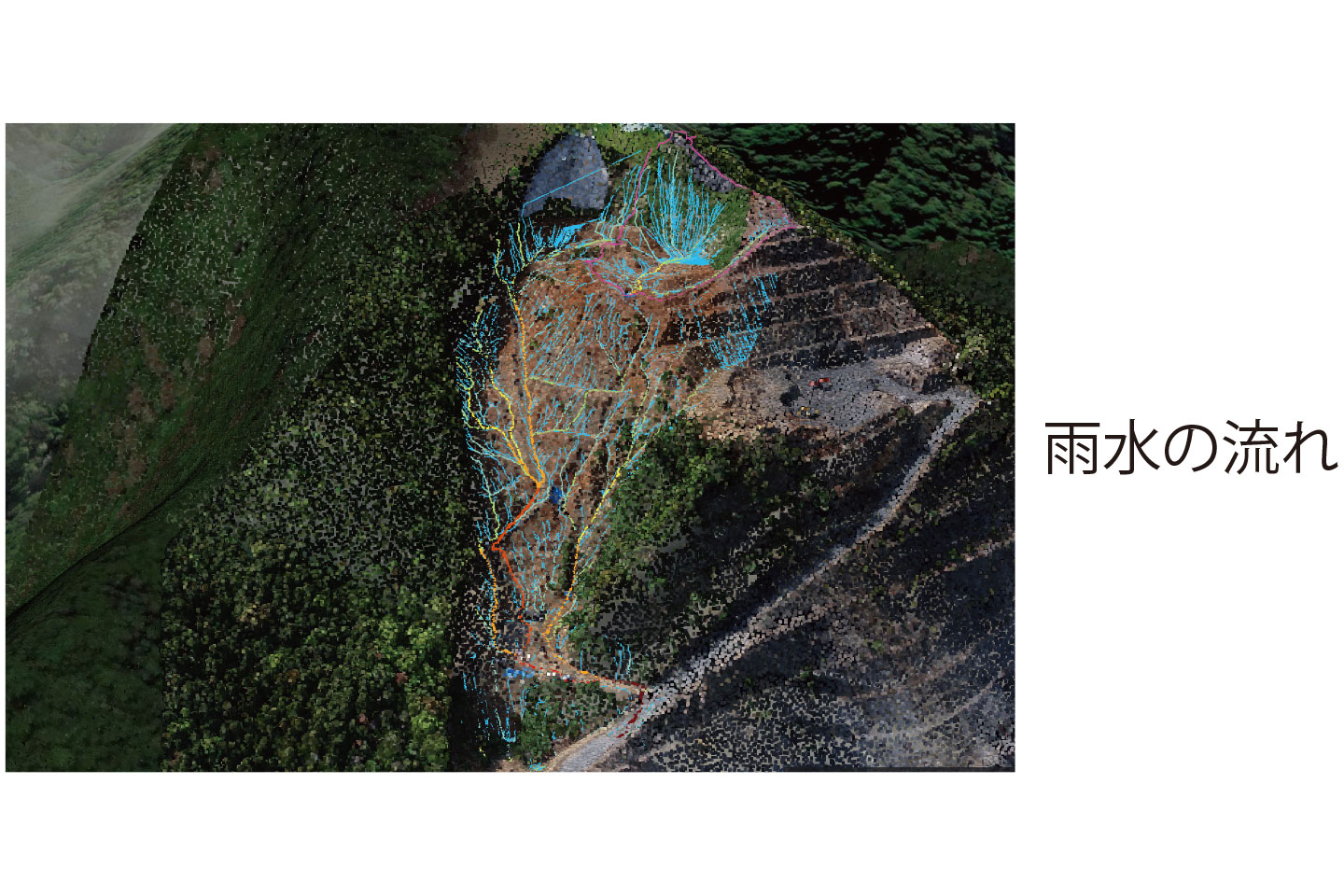 法面施工時に雨が降ると、法面崩壊や土砂流出など大きな被害が発生する可能性がある。事前に雨水の流れを予想することで、対策が打てた。