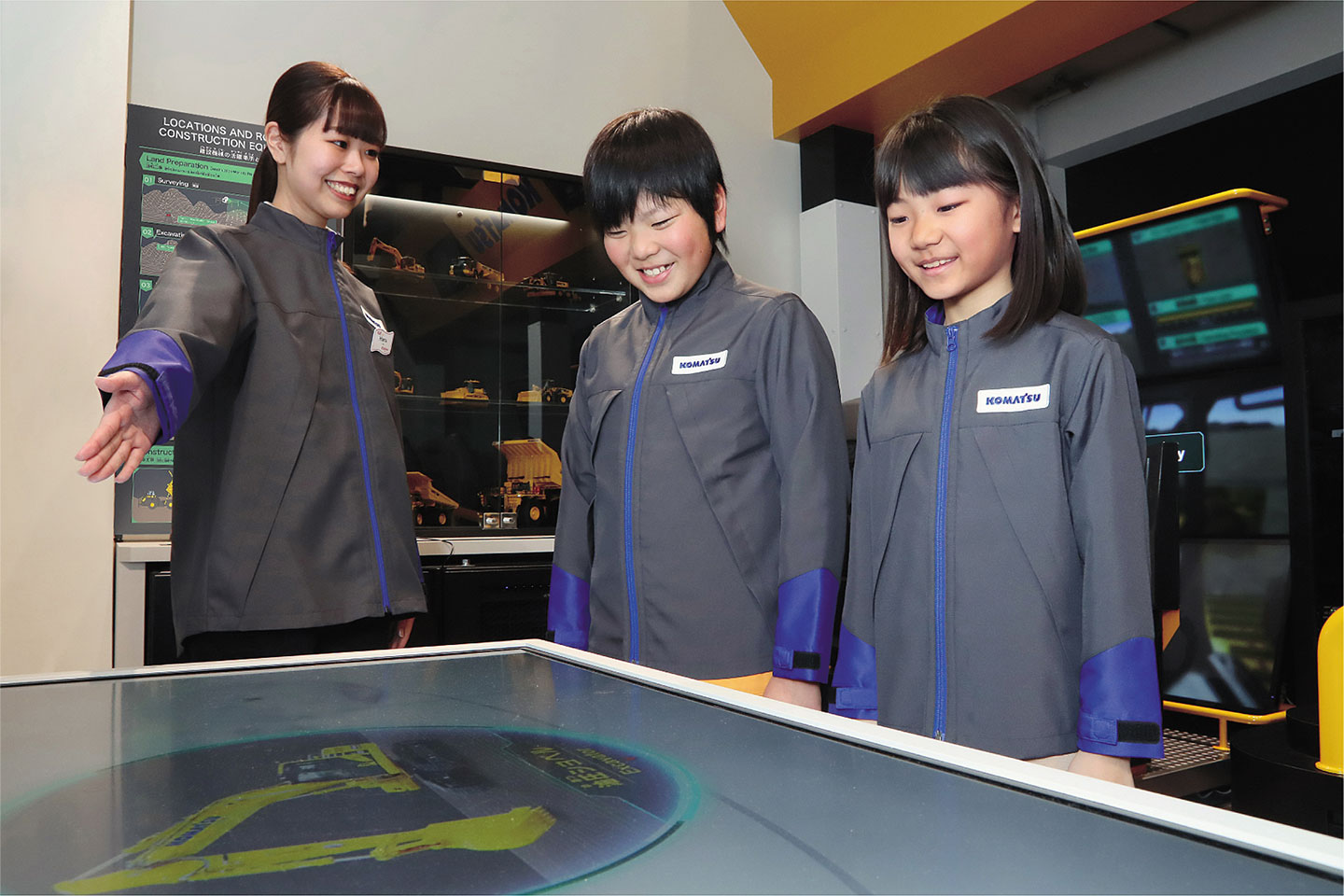 スタッフが建設機械開発者のマネジャーとして、子どもたちと一緒に仕事を進めていく。ユニフォームはコマツのコーポレートカラーをあしらったオリジナルデザインを採用