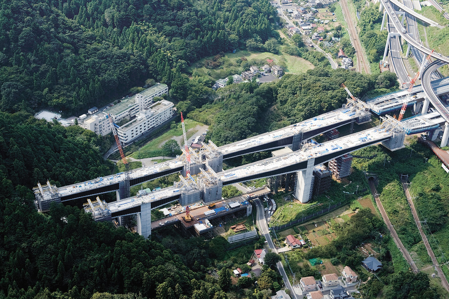 (写真:須田氏が現場監督を行った片持ち架設工法による張り出し長が国内最長の裏高尾橋の工事の様子)