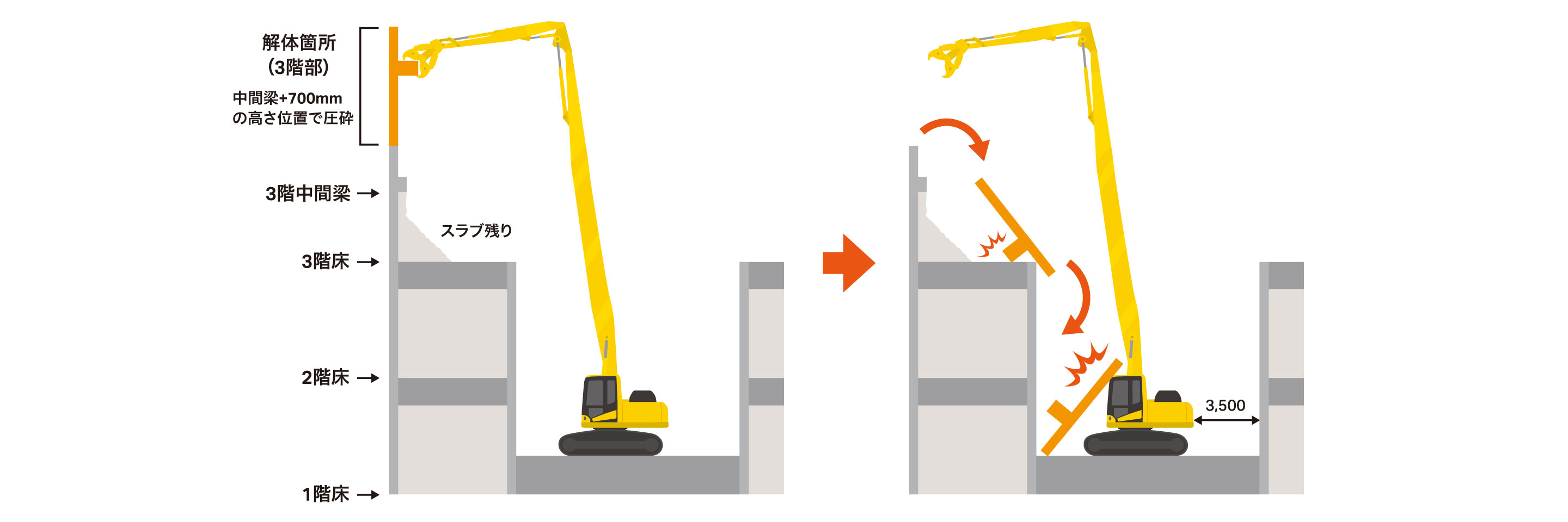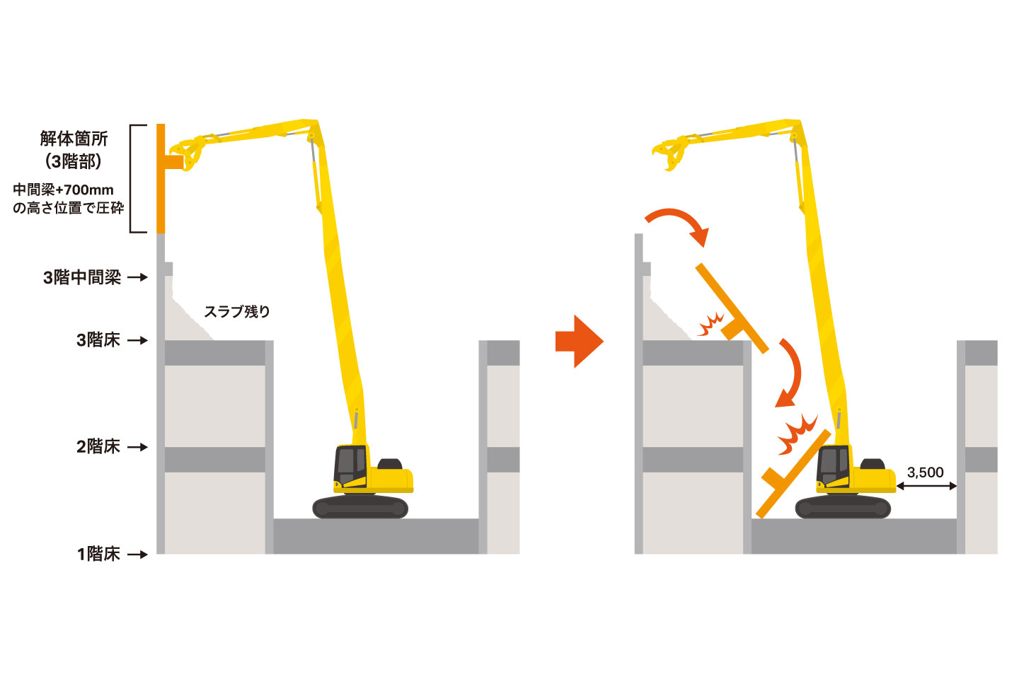 ● 不測の事態に備えるために、解体用重機をランクアップした重機に入れ替え、今までの機械位置よりも離れた位置から解体を行う。