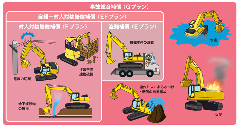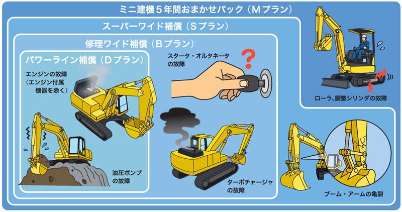 コマツ販売代理店が、取扱説明書の記載に基づく定期点検・メンテナンスを代行し、補償対象装置が故障した場合の修理費は補償制度から支払われます。